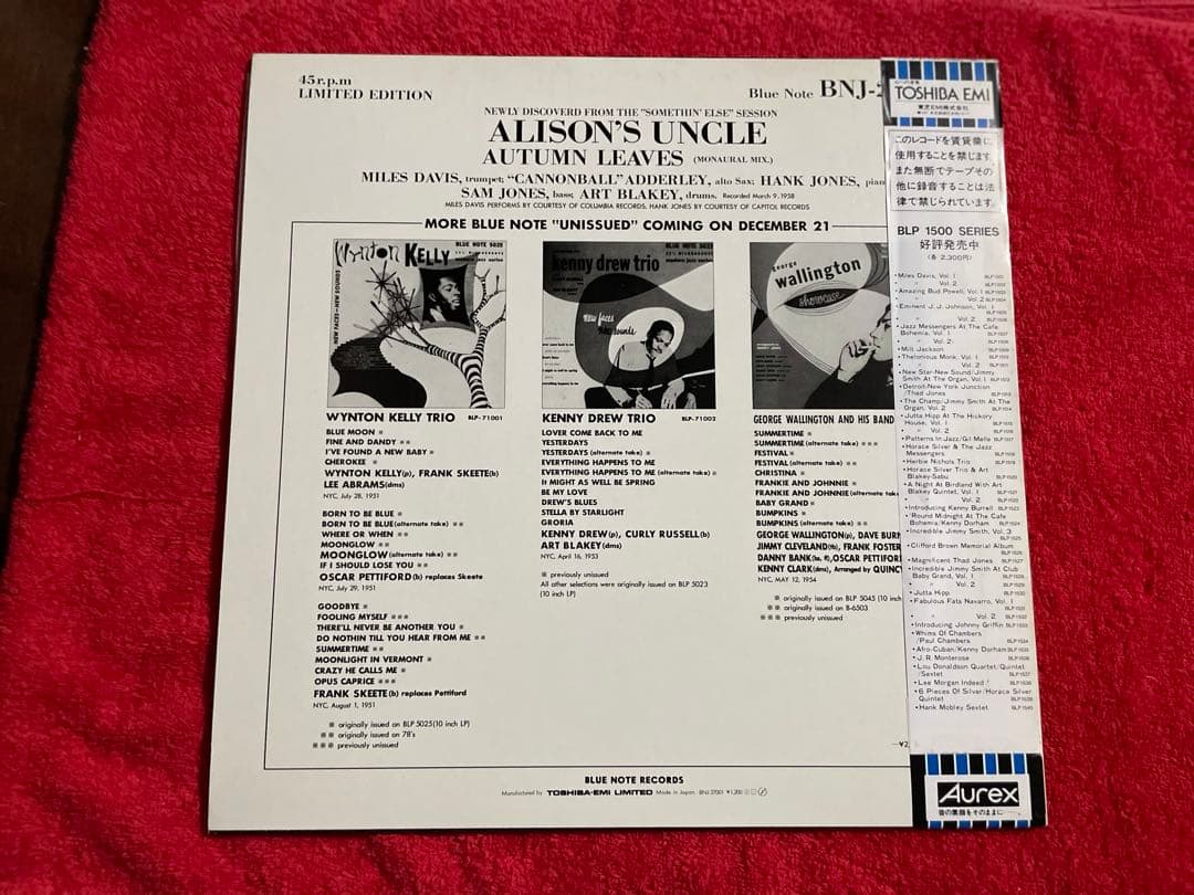 - ✔ This is a rare vinyl record featuring the legendary jazz artist Cannonball Adderley with the classic tracks "Alison's Uncle" and "Autumn Leaves." The record is in excellent condition, with no noticeable scratches or dirt on the surface,ensuring optimal sound quality. The jacket is relatively clean and well-preserved,and it comes with the obi and explanatory booklet,making it a valuable addition to any jazz or vinyl collection.