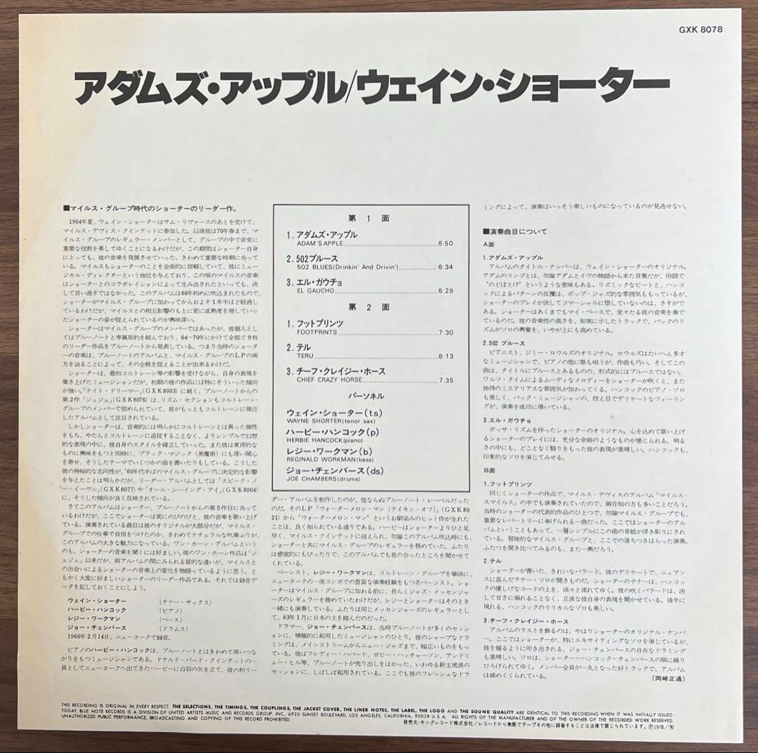 - ✔ Experience the timeless jazz masterpiece with this reissued LP of Wayne Shorter's "Adam's Apple." This Japanese domestic pressing,released without a obi strip,features a beautifully preserved vinyl in excellent condition, making it a must-have for jazz enthusiasts and collectors alike. Recorded in 1978 under the renowned Blue Note label (GXK8078), this album exemplifies the Hard Bop style and showcases Shorter's exceptional artistry.