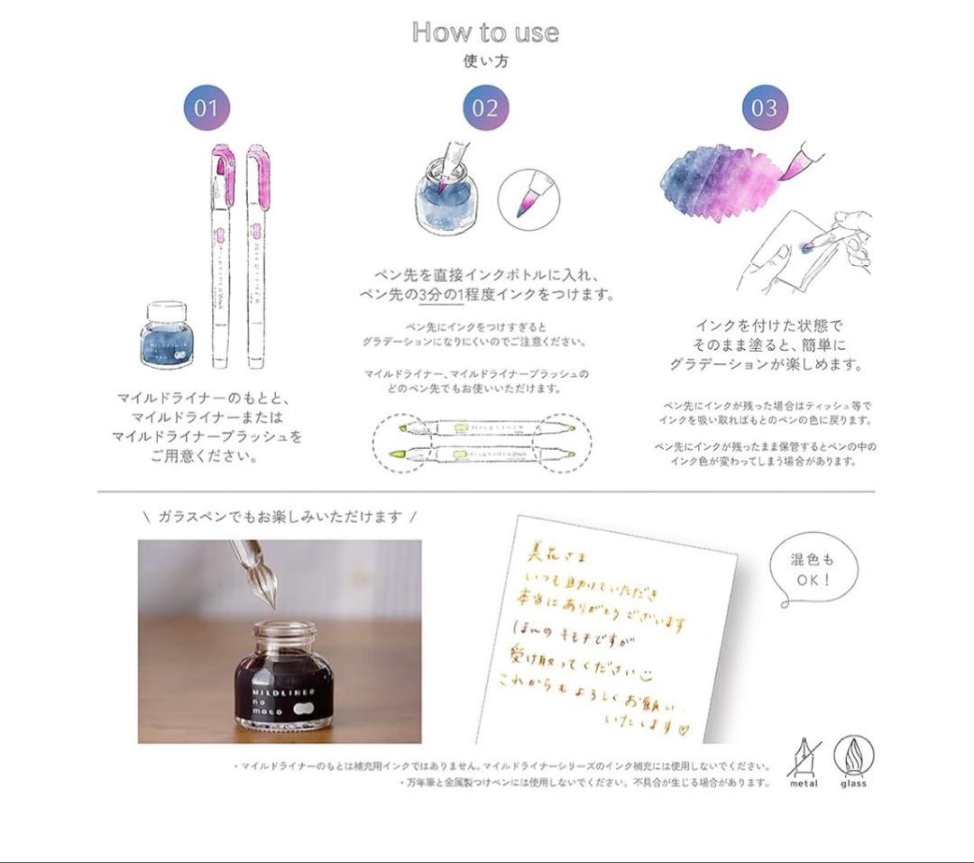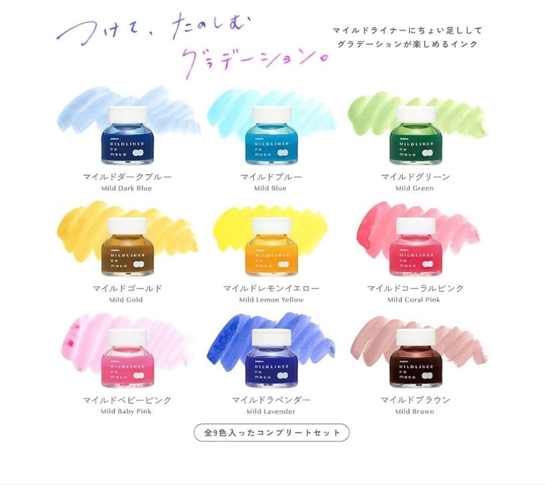 - ✔ Key features include the ability to easily produce elegant gradients by lightly applying ink to your existing Mild Liner or Mild Brush pens. The unique ink combination and application techniques enable unpredictable color variations,making each piece one-of-a-kind. The nine available colors are Mild Dark Blue,Mild Blue,Mild Green,Mild Gold,Mild Lemon Yellow,Mild Coral Pink,Mild Baby Pink,Mild Lavender,and Mild Brown,offering a broad spectrum for your creative projects.